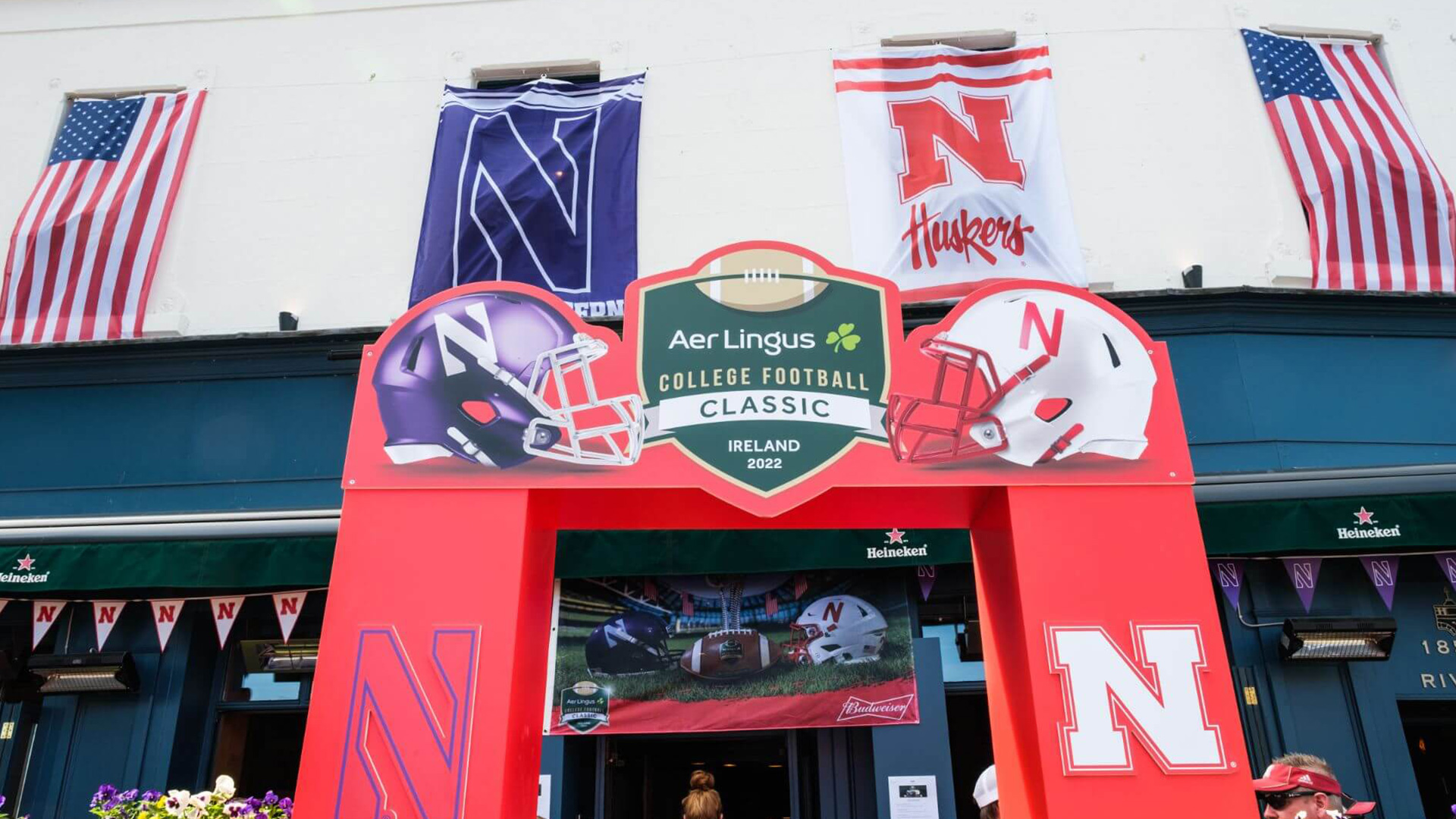 In Temple Bar we converted two iconic Dublin pubs into team bars. Buskers on the Ball became Buskers ‘Home of the Huskers’ (Nebraska Huskers) and Fitzsimons became Coach Fitz’ ‘Home of the North-Western Wildcats’. These bars were given completely new looks with extensive team and brand dressing throughout as well as customized entranceways and bunting hung throughout Temple Bar.